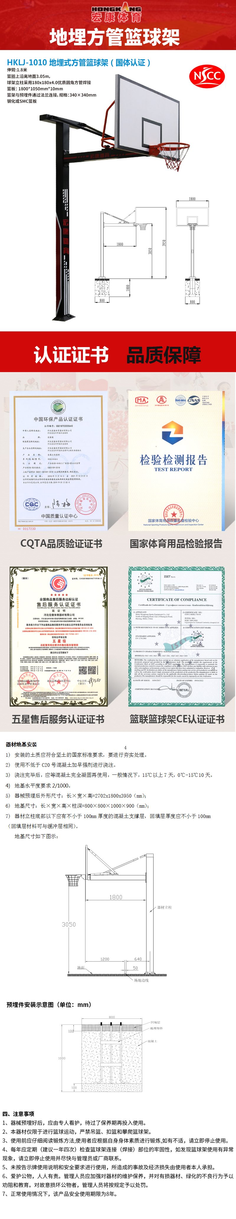 商品名称:宏康健 HKLJ-1010 地埋式方管篮球架/副