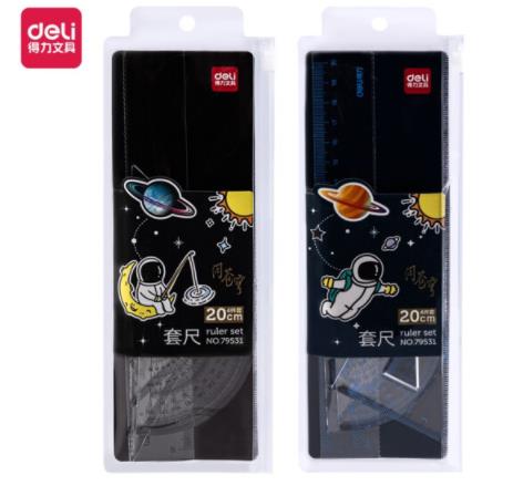 得力(deli)×中国航天20cm波浪边直尺套装 (直尺+三角尺*2+量角器)考试绘图文具套装 颜色随机 79531